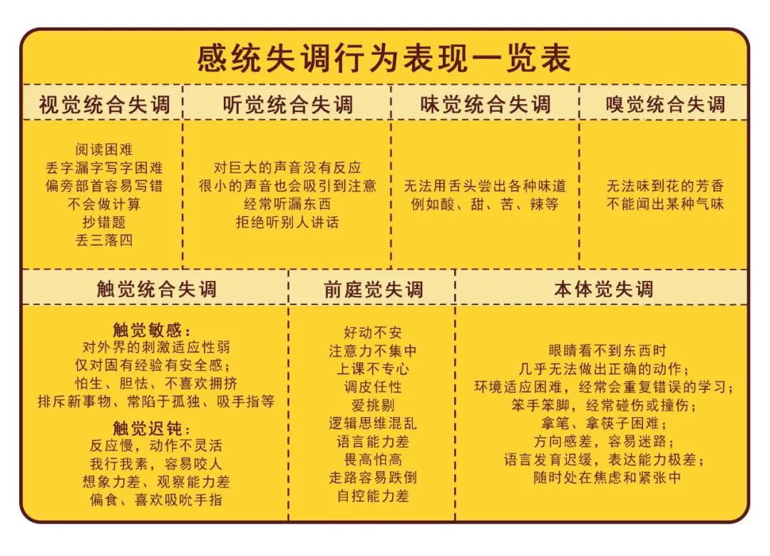 感統(tǒng)失調(diào)的表現(xiàn)還要從視覺、聽覺、味覺、嗅覺、觸覺、前庭覺和本體覺這七個(gè)感官上的失調(diào)表現(xiàn)說起,我將這些表現(xiàn)整理成了一張表格,以便大家對照。