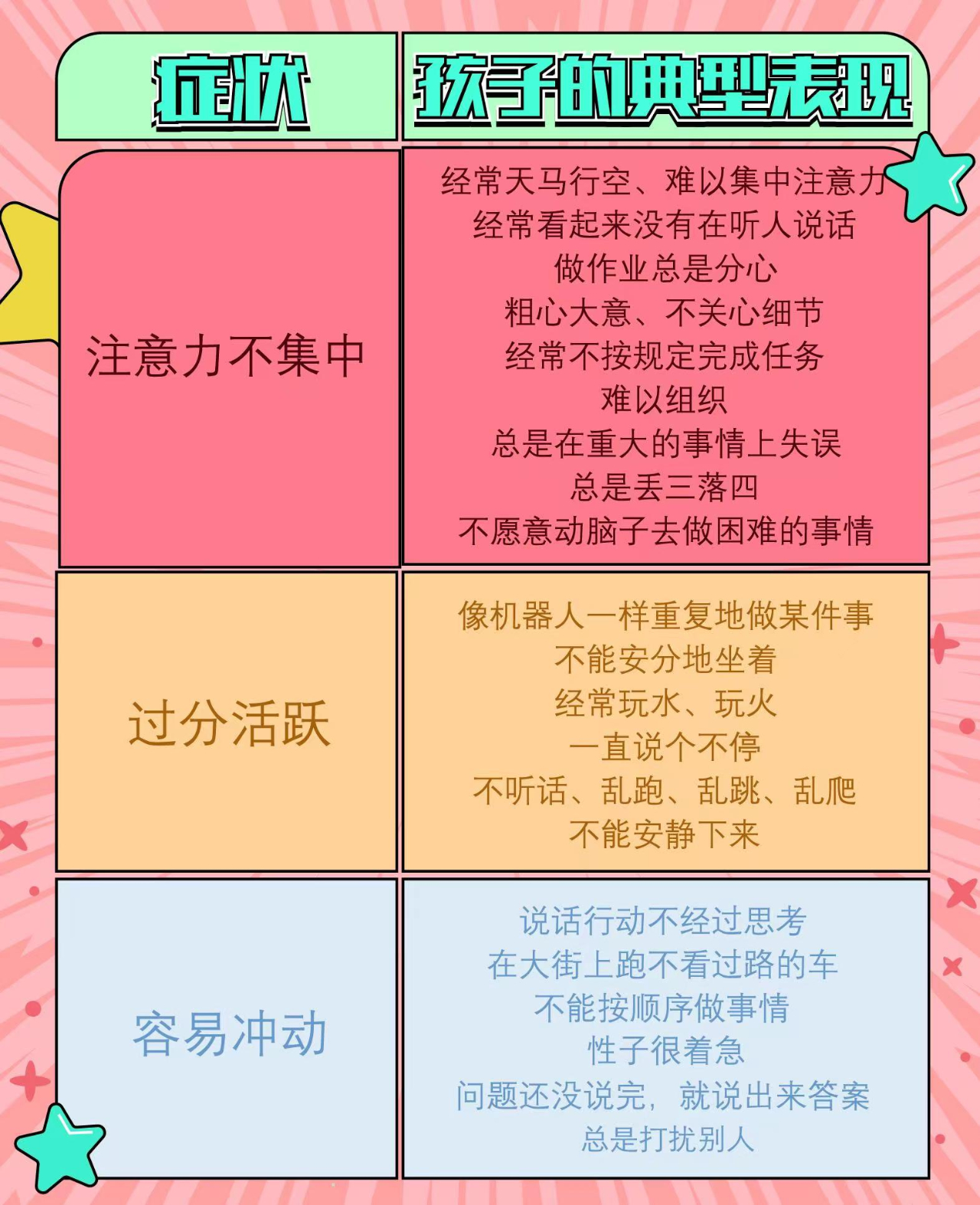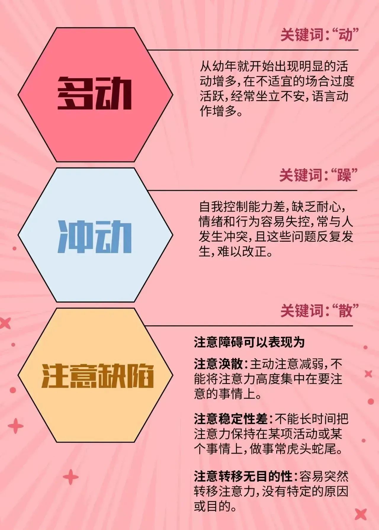 當孩子上面這些表現明顯比同齡孩子更明顯時,父母就一定要需要重視起來,因為它們可能預示著孩子患上了注意缺陷多動障礙,也就是家長口中的多動癥